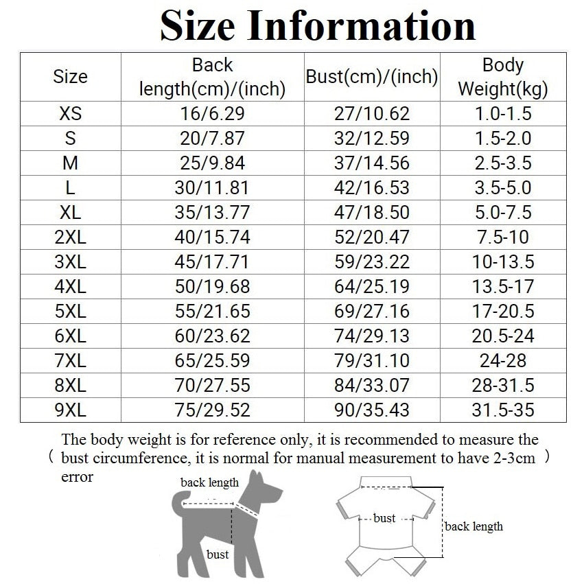 Faça a medição do tórax, pescoço e comprimento do seu animal de estimação, conforme definido na imagem abaixo. Ao tirar as medidas, certifique-se de deixar uma pequena folga nos tamanhos do pescoço e do tórax, para que seu animal consiga usar uma roupinha com conforto, sem apertar, e tenha mobilidade. Em seguida, compare as medidas com a tabela abaixo para saber o tamanho da roupinha do seu animal.